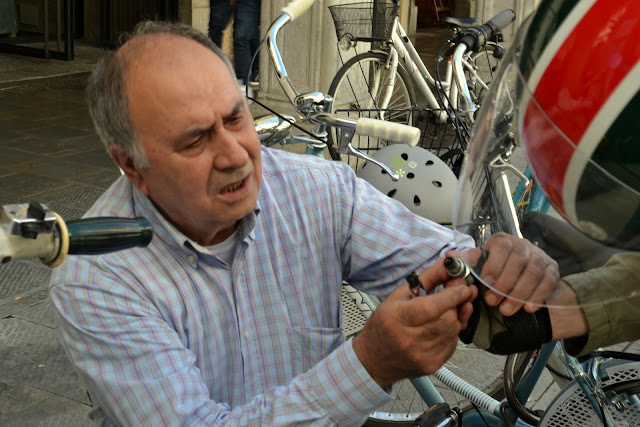 and chat with him} and talk about his old lambretta and his work as a mechanic.